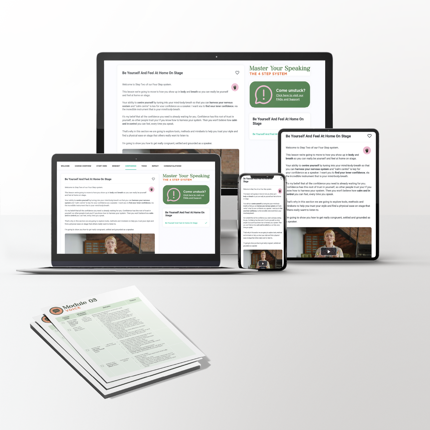 The 4 modules will each take about an hour each to go through. They are divided into short 10 min sections so you could choose to take each module in one go as an hour max, or divide them into 10-minute lessons on a daily basis. It’s designed to prepare you for a specific public speaking event.