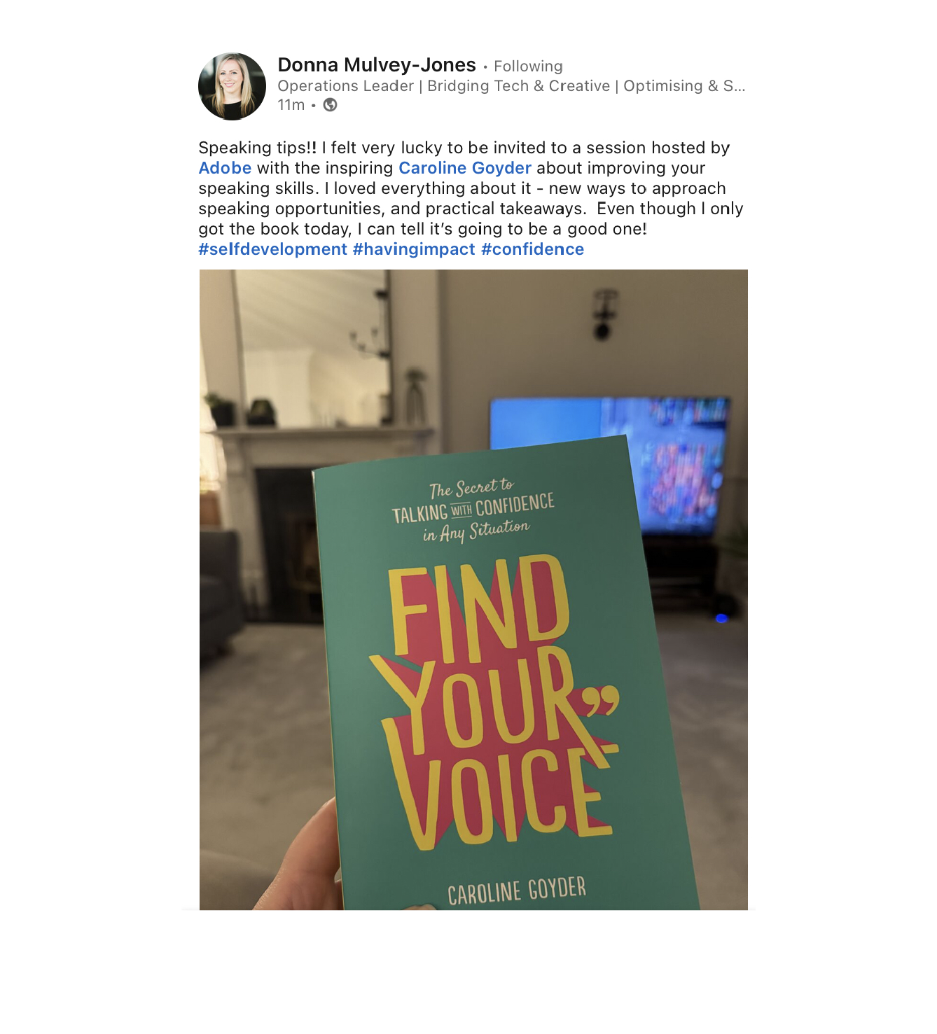 After being on maternity leave, I'd noticed my confidence had greatly decreased and I wanted to find a way to rebuild this so I could hone my skills further. Presenting and influencing are key elements to my role and therefore important for me to be able to speak with impact. I was confident that Caroline’s work would help to increase my confidence again and I joined Caroline’s online course Master Your Speaking. Following the lessons and short videos that kept my attention and the colourful style, it has provided me with lots of tips and techniques. It helps that the materials are available to download and to better prepare myself for when I’m asked to do immediate speaking. It has surprised me that there are lots of different factors that come together to make a confident speaker - not just practicing. If you would like to build on your speaking this is the course for you, It's easy to access, easy to digest and very actionable.
